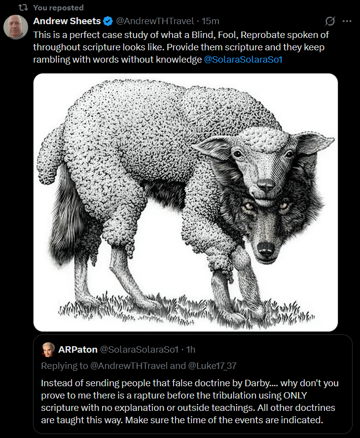 This screenshot is from last night, I had already written this blog and was doing the edits… so I thought I would include it as an example of what happens when you confront false doctrine. Take note of what I asked this man to do and how he responded. You get this response when you refuse other doctrines and stick only to the word for your doctrine. He called me a Blind, Fool and Reprobate because I said, “Instead of sending people that false doctrine by Darby…. why don’t you prove to me there is a rapture before the tribulation using ONLY scripture with no explanation or outside teachings. All other doctrines are taught this way. Make sure the time of the events are indicated.”